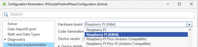 Go to Hardware Implementation tab, and select the connected Raspberry Pi board from the list. This example uses Raspberry Pi (64bit) by default.