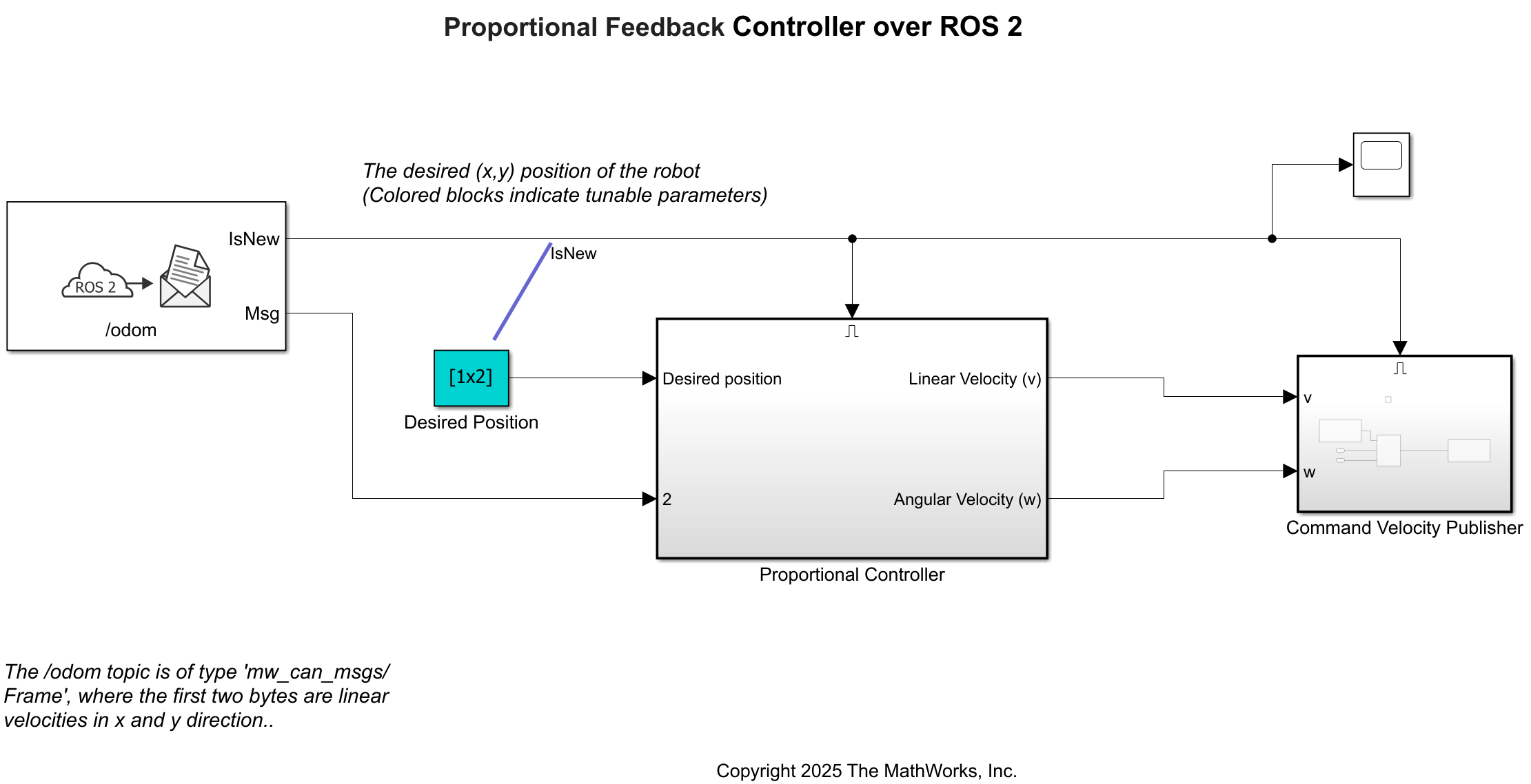 Open the ROS2FeedbackControl.slx model, which simulates a proportional controller for a differential-drive mobile robot. At each step, the algorithm steers the robot toward the target and moves it forward.
