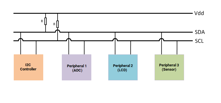 The I2C bus on the device has an I2C Controller that is connected to two bidirectional lines, Serial Data Line (SDA) and Serial Clock Line (SCL). These two lines are connected to a pair of pins on the attached I2C peripheral device. The I2C peripheral device has a unique 7-bit or 10-bit address that is provided by the manufacturer. If the address is not unique, refer to the device data sheet to reconfigure the address.