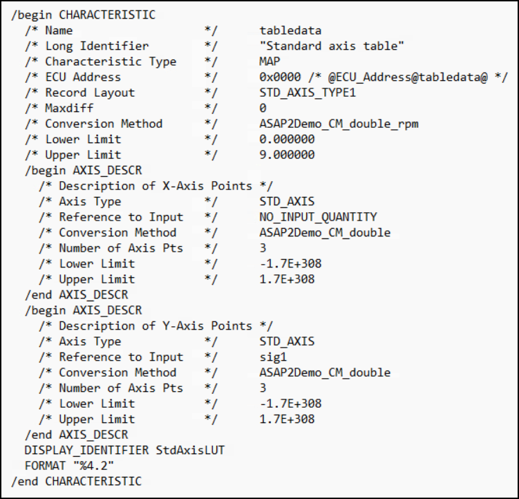 Here is an example of an n-D Lookup Table record generated into an ASAP2 file in Standard Axis format.