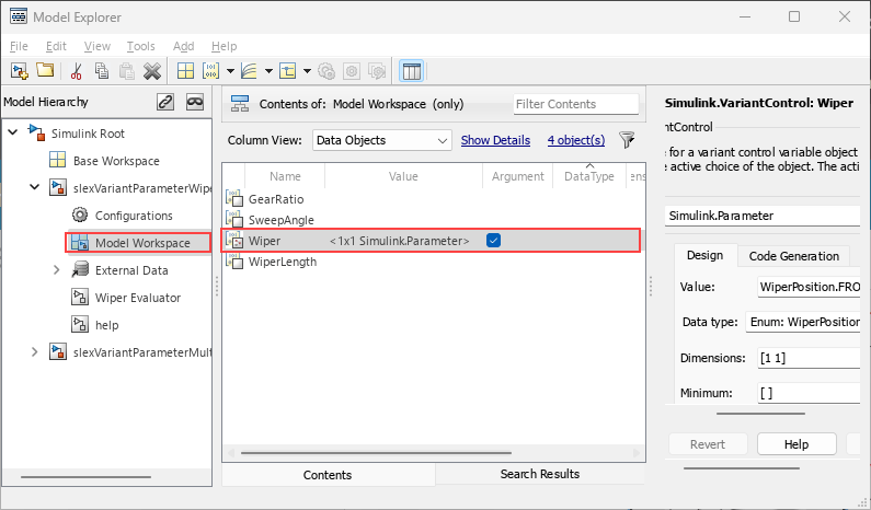 • The slexVariantParameterWiper model takes the motor speed as input and uses three variant parameters GearRatio, SweepAngle, and WiperLength defined in the model workspace to calculate the value of the required output parameters. These variant parameters take a different value for each of the driver, passenger, and rear wiper positions. The variant parameters use a Simulink.VariantControl object named Wiper to specify the variant conditions for the choices. The Wiper value can be set to the values WiperPosition.FRONT_DRIVER, WiperPosition.FRONT_PASSENGER, or WiperPosition.REAR defined in the WiperPosition.m file. The ActivationTime property of Wiper is set to startup and is specified as a model argument.