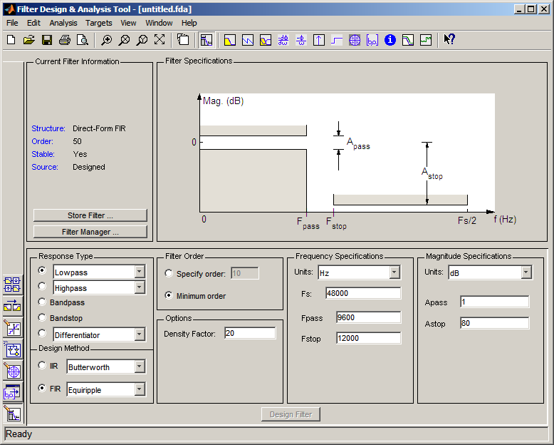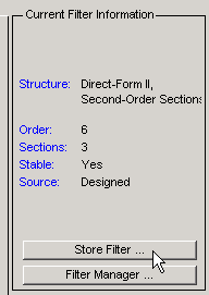 Remarquez que le bouton Design Filter ne sera plus actif une fois que vous aurez calculé les coefficients pour le design de votre filtre. Ce bouton sera actif à nouveau si vous apportez des changements aux spécifications du filtre.
