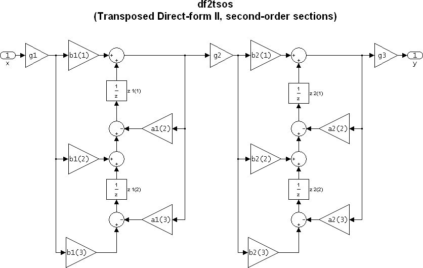 Hd = dfilt.df2tsos(b1,a1,b2,a2,...) returns a discrete-time, second-order section, direct-form II, transposed filter, Hd, with coefficients for the first section given in the b1 and a1 vectors, for the second section given in the b2 and a2 vectors, etc.