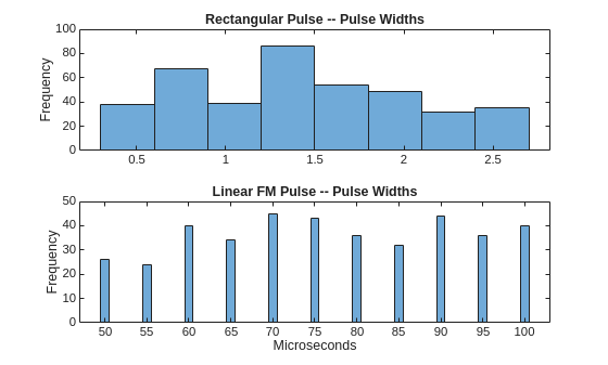 To generate the linear-FM pulse waveforms, the software uses phased.LinearFMWaveform with random parameterizations from these ranges:
