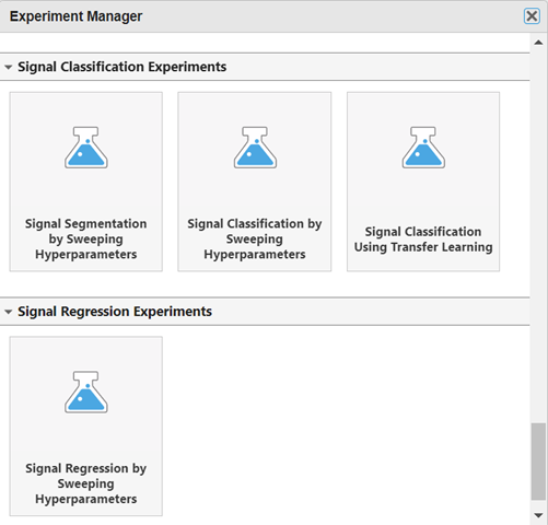 Experiment Manager (Deep Learning Toolbox) enables you to train networks with different hyperparameter combinations and compare results as you search for the specifications that best solve your problem. Signal Processing Toolbox™ provides preconfigured templates that you can use to quickly set up signal processing experiments. For more information about Experiment Manager templates, see Quickly Set Up Experiment Using Preconfigured Template (Deep Learning Toolbox).