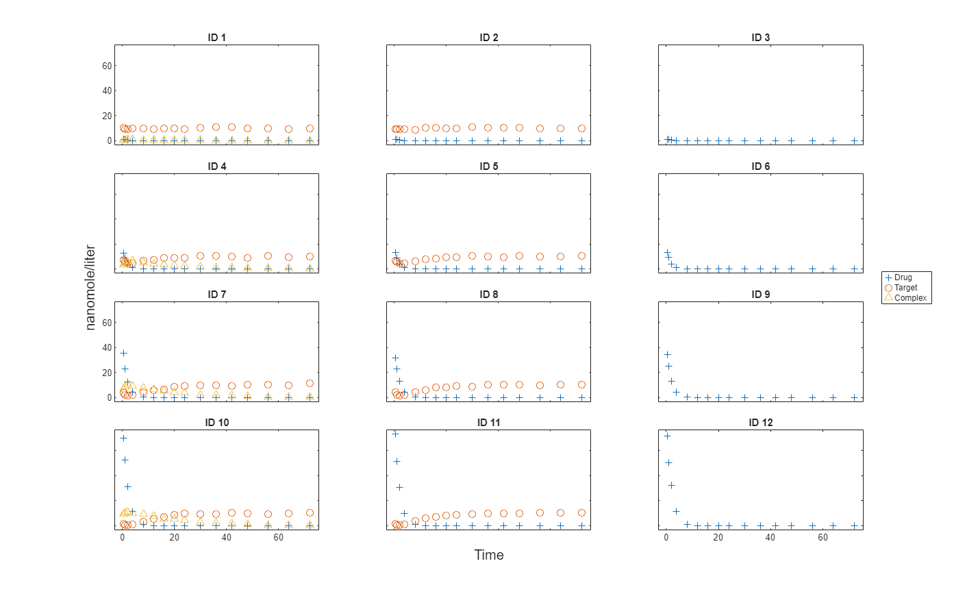 t = sbiotrellis(gData,"ID","Time","Drug",Marker="+",LineStyle="none"); plot(t,gData,"ID","Time","Target",Marker="o",LineStyle="none"); plot(t,gData,"ID","Time","Complex",Marker="^",LineStyle="none"); t.hFig.Position = [100 100 1280 800]; t.YLabel = "nanomole/liter";