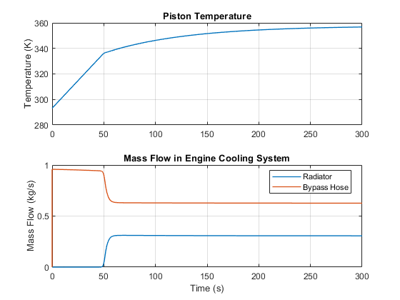 Ces tracés illustrent l’effet produit par l’ouverture du thermostat dans le système de refroidissement du moteur. La température du piston augmente régulièrement jusqu’à l'ouverture du thermostat. Le débit du liquide de refroidissement dans le radiateur augmente alors fortement tandis que le débit du liquide de refroidissement dans le tuyau de dérivation diminue. Étant donné que le liquide de refroidissement qui traverse le radiateur libère de la chaleur dans l'atmosphère, la température du piston augmente plus lentement.
