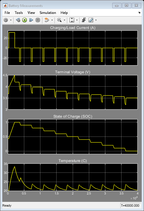 Un modèle thermique simple est utilisé pour modéliser la température de la batterie. On suppose que le refroidissement s’effectue principalement par convection et le chauffage par la résistance interne. Il est possible de modéliser un bloc de batteries en connectant en série plusieurs copies du bloc de cellule de batterie.