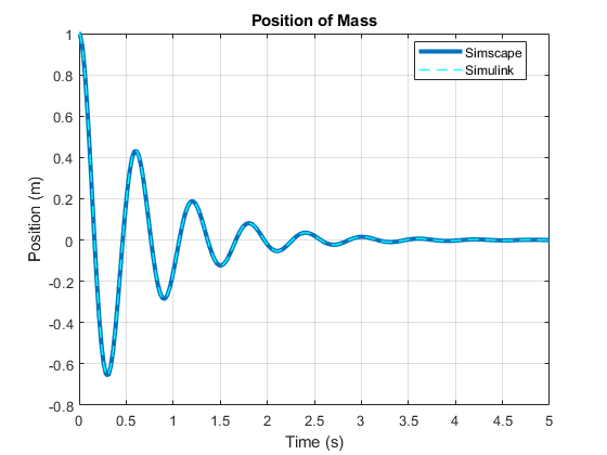 Cet exemple présente deux modèles de système masse-ressort-amortisseur : l’un utilise des blocs d’entrée/sortie Simulink® et l’autre utilise des réseaux physiques Simscape™.
