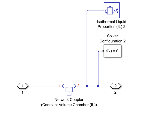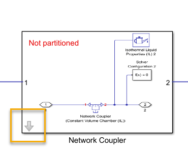 You can use network coupler blocks to partition your Simscape model at the location of the block. In this example, the Network Coupler subsystem splits the network between the flow source and the flow resistance. The subsystem contains a Network Coupler (Constant Volume Chamber (IL)) block, an Isothermal Liquid Properties (IL) block, and a Solver Configuration block. By default, these blocks are commented out.
