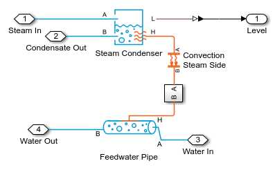 Les blocs Saturated Fluid Chamber et Turbine sont des composants personnalisés qui s’appuient sur la Simscape™ Foundation Two-Phase Fluid Library. Le bloc Saturated Fluid Chamber modélise un volume de liquide saturé et un volume de vapeur saturée séparés. Il est utilisé pour créer la chaudière et le condenseur.