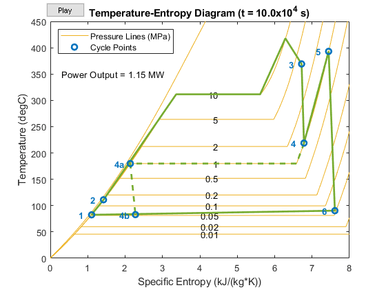 Cette figure présente une animation illustrant le cycle de Rankine sur un diagramme température-entropie au cours du temps. Le flux de vapeur principal correspond à la boucle des points 1 à 6 du cycle. Le flux de vapeur extrait correspond à la ligne en pointillés des points 4 à 4b du cycle. Dans ce modèle, la vanne d'étranglement située en amont du point 3 du cycle offre un certain contrôle sur la puissance de sortie.