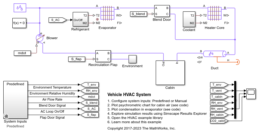 Cet exemple modélise le flux d’air humide au sein d’un système de chauffage et de climatisation d’un véhicule. L'habitacle du véhicule est représenté sous la forme d’un volume d'air humide échangeant de la chaleur avec l'environnement extérieur. L'air humide circule à travers un volet de recirculation, un ventilateur, un évaporateur, un incorporateur et un radiateur avant de retourner dans l’habitacle. Le volet de recirculation sélectionne l'admission du flux provenant de l'habitacle ou de l'environnement extérieur. La porte de l’incorporateur dévie le flux autour du radiateur pour contrôler la température.