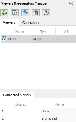Pour instrumenter votre modèle sans ajouter de blocs, envisagez d’utiliser la fonction Viewers and Generators Manager. Pour ouvrir le gestionnaire, dans l’onglet Simulation, puis, dans la section Prepare, sélectionnez Viewers Manager. Dans cet exemple, Viewer and Generators Manager est configuré pour enregistrer deux signaux (Stick et alpha) dans le bloc Scope nommé Scope1.