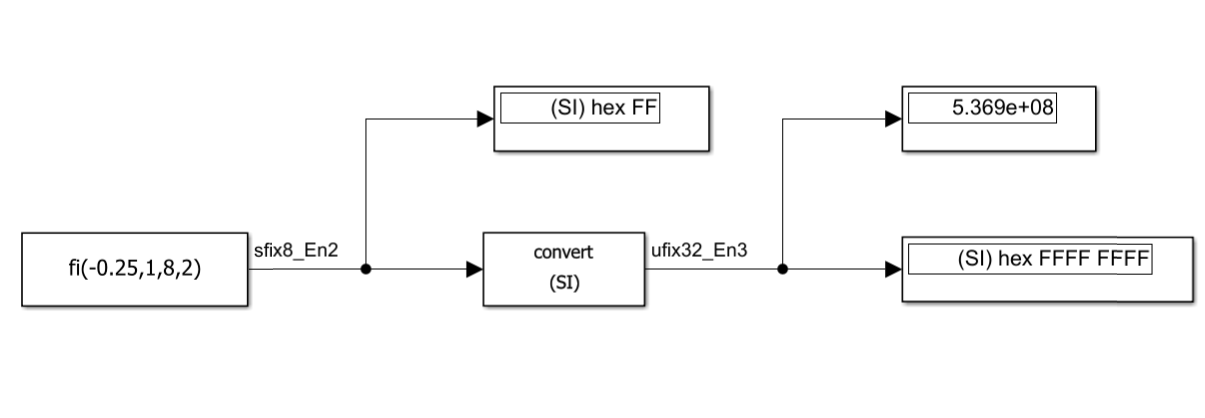 If you select Stored Integer (SI), the block does not perform a lower-level bit reinterpretation of a floating-point input signal. For example, if the input is single and has value 5, the bits that store the input in memory are given in hexadecimal by the following command.