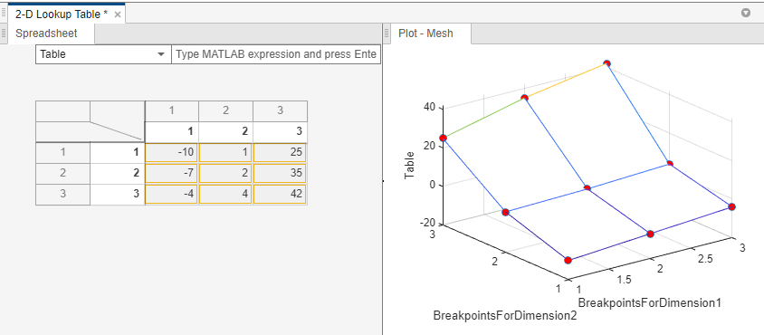 In the spreadsheet, enter the breakpoint vectors and table data in the appropriate cells. To change data, click a cell, enter the new value, and press Enter.