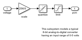 Le bloc Quantizer discrétise le signal d’entrée à l’aide d’un algorithme de quantification. Le bloc utilise une méthode d’arrondi à la valeur la plus proche pour mapper les valeurs de signal sur les valeurs quantifiées en sortie qui sont définies par le paramètre Quantization interval. Un signal d’entrée lisse peut prendre une forme en escalier après quantification.
