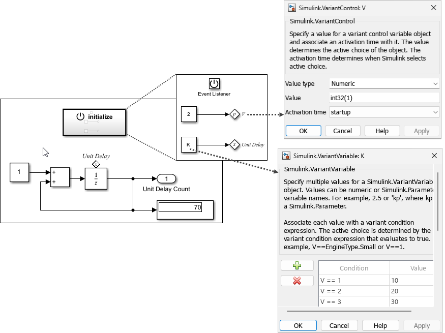 Simulink® model conditionally. For an overview of variant parameters, see Use Variant Parameters to Reuse Block Parameters with Different Values.