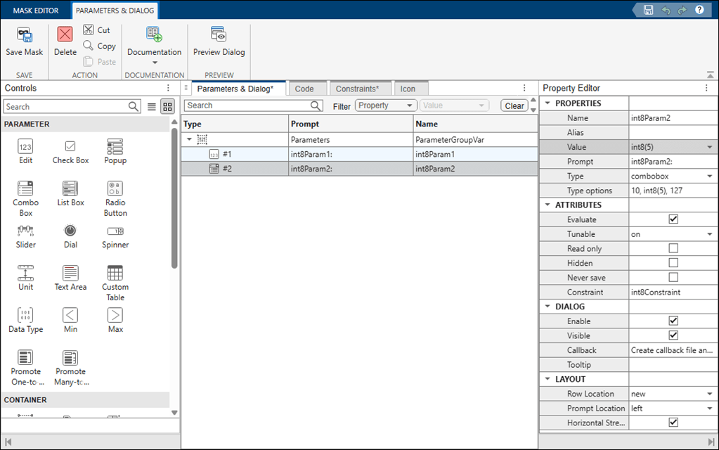 2. In the Mask Editor, on the Parameters & Dialog tab, create an Edit parameter named int8Param1 and a Combo Box parameter named int8Param2. For the Combo Box parameter, you must select the Evaluate attribute before associating a constraint.