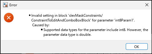 The model slexMaskConstraints contains the Subsystem block ConstraintToEditAndComboBoxBlock, whose parameters int8Param1 and int8Param2 must be valid int8 values.