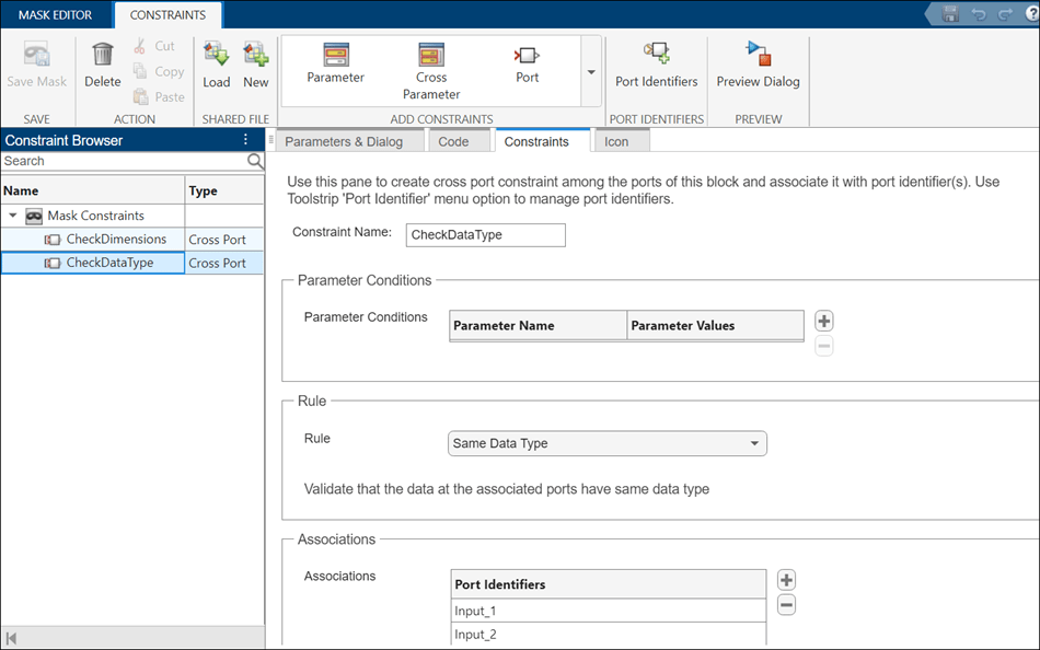 This example shows how to create cross port constraints to validate compile-time signal attributes on ports of the same masked block. For example, you can set a constraint on the input and output port signals of the masked block so that they have the same data type. The rules for the cross port constraints are predefined. The available rules are Same Data Type, Same Dimension, and Same Complexity. Additionally, you can also set parameter conditions. Each port in the masked block is identified by a port identifier. The cross port constraint association is done through port identifiers.