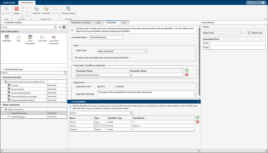 You can create cross-port constraints to validate compile-time signal attributes on ports of the same masked block. For example, you can set a constraint on the input and output port signals of the masked block so that they have the same data type. The available rules for cross-port constraints are Same Data Type, Same Dimension, and Same Complexity. You can also set parameter conditions. The constraint is validated only if the parameter condition is satisfied. Each port in the masked block is identified by a port identifier. The cross-port constraint association is created through port identifiers.