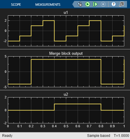 For this model, when input u1 is greater than 0 or input u2 is greater than 0.5, the output is 4. Otherwise, the output is -4. The Scope block displays the output from the Merge block with inputs u1 and u2.
