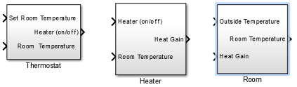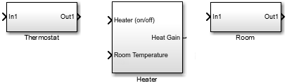 At the top level of the house heating model, use Subsystem blocks to organize your model and create the structure. The model includes the subsystems Thermostat, Heater, and Room.