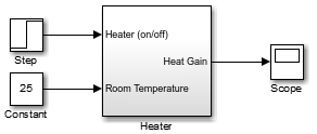 Add a Gain block to the Heater subsystem. Set the Gain parameter to