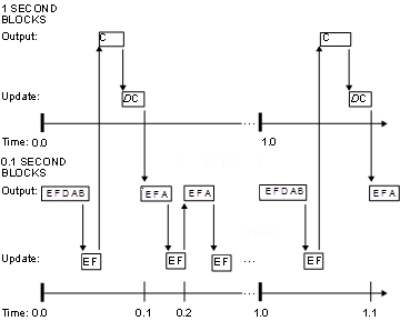 This figure shows the scheduling of computations when the generated code is deployed in a real-time system in multitasking mode. The generated program is shown running in real time as two tasks under control of interrupts from a 10 Hz timer.