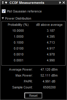 The CCDF Measurements panel displays complimentary cumulative distribution function measurements. CCDF measurements in this scope show the probability of the instantaneous power of a signal being a specified level above the average power of the signal. These measurements are useful indicators of the dynamic range of a signal.