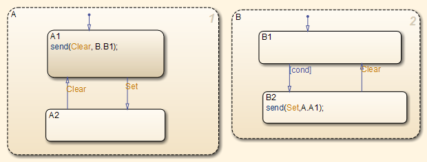 The following chart creates cyclic behavior. State A calls state A1, which broadcasts a Clear event to state B, which calls state B2, which broadcasts a Set event back to state A, causing the cyclic behavior.