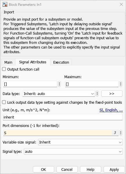 Open the Block Parameters dialog box for the inport block In1. By default, Port dimensions parameter is set to -1, indicating that the port inherits dimensions from the connected signal. Set Port dimensions to the symbolic dimension S.