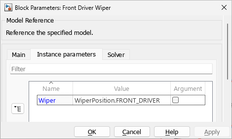 slexVariantParameterWipermodel, the model argumentWiperis set to an instance-specific value corresponding to the wiper position. During simulation, the active choice of variant parameters in the referenced model vary for each instance based on the value ofWiperset from the top-level model. This image shows the instance value specified forWiperin the Block Parameters dialog box of the Model blockFront Driver Wiper.
