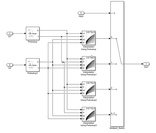 The model ex_interpolation_optimize uses Prelookup blocks to input signals to several Interpolation Using Prelookup blocks. The output of these Interpolation blocks are connected to a Multiport Switch block.