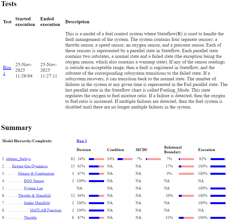 If you analyze coverage for your model using the Run button, Simulink® Coverage™ creates a model coverage report for the specified model named model_name_cov.html. The Simulink Coverage report opens in the Coverage Details pane of the Simulink window.