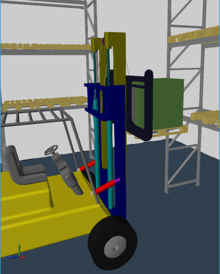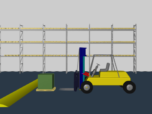 This example shows how to create dynamic cameras for a multibody model. You create two types of dynamic cameras to view an operating forklift. The first camera uses the tracking mode to show the perspective of a driver, and the second relies on several specified keyframes.