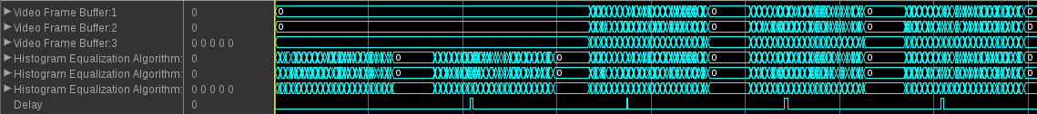 The buffer reuses the input frame control signals for the output frame. At a pop request, the buffer returns the frame data starting at the next input ctrl.vStart signal. Therefore, if you pop the buffer in the blanking period at the end of the written frame, the latency is less than one frame as shown in the waveform. The top three signals are the output of the frame buffer. The bottom four signals are the input to the frame buffer, from the FPGA-targeted subsystem in the Histogram Equalization with Zynq-Based Hardware example. The bottom signal is the pop request.