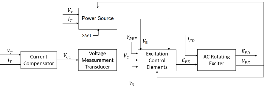 The AC Rotating Exciter component models the AC rotating exciter, which produces a field voltage that is applied to the controlled synchronous machine. The block also feeds the exciter field current (VFE) back to the excitation system.
