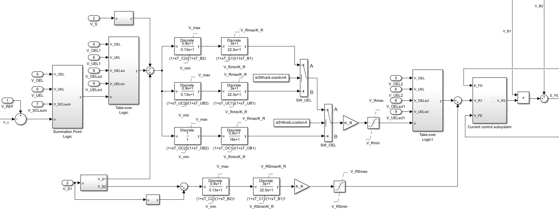 There are two Take-over Logic subsystems. They model the take-over point input location for the OEL, UEL and SCL voltages. For more information about using limiters with this block, see Field Current Limiters.