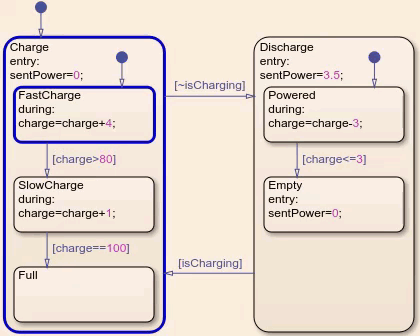In this example, you use child states to model the variable charging rates in a rechargeable battery system.