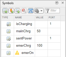 The State Transition Table block Battery Control contains the control logic for the system. To determine whether the battery charges or discharges, the table receives a Manual Switch block as an input.