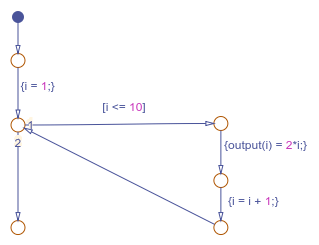 À mesure que la valeur du compteur i augmente de 1 à 10, le diagramme de flux définit les éléments d’un tableau output. La boucle dans ce diagramme de flux est équivalent à cet extrait de code MATLAB :