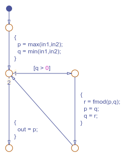 Dans cet exemple, un diagramme de flux combine des transitions et des jonctions de connexion pour créer une boucle while qui calcule le plus grand commun diviseur des entrées.