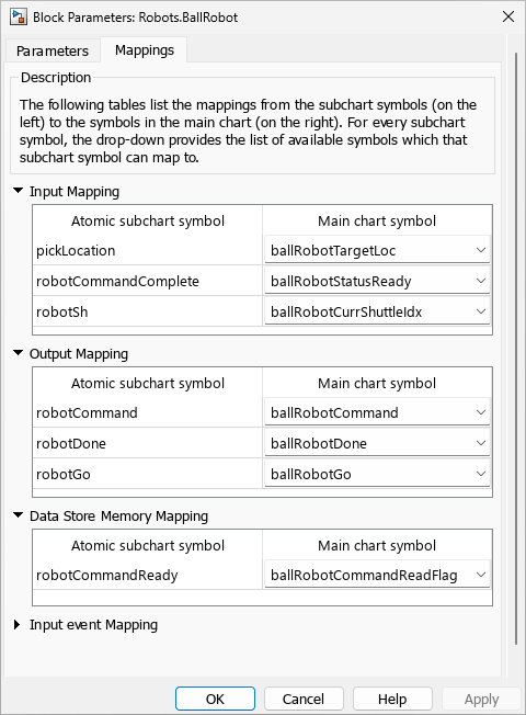 The Block Parameters window shows how symbols in the BallRobot atomic subchart map to data objects in the Controllers chart. For example, the pickLocation input in BallRobot receives data from the ballRobotTargetLoc object in Controllers. For more information about mapping, see Map Variables for Atomic Subcharts and Boxes.