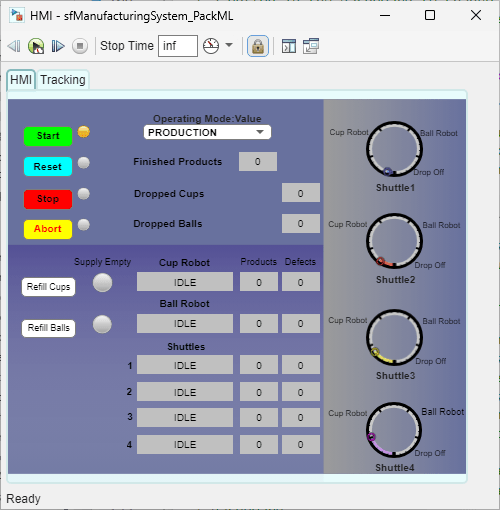 The production line starts, stops, refills, and changes operating modes in response to user input. The dials on the right side of the dashboard indicate where each shuttle is in the manufacturing system. The dashboard also displays the number of completed products, dropped items, and other production information.