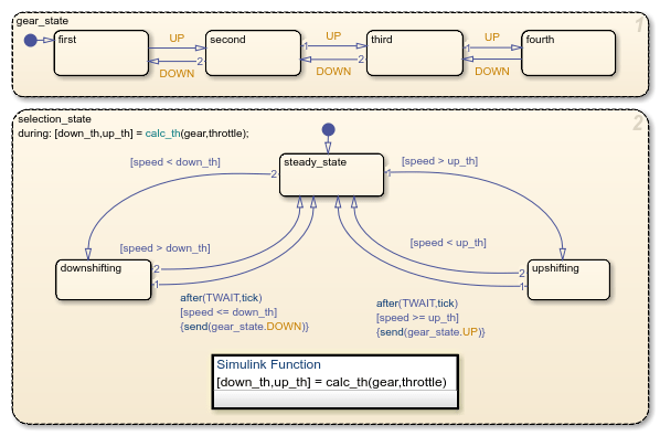 The state selection_state operates in parallel with gear_state. As the speed of the car changes, selection_state moves between the downshifting, upshifting, and steady_state operating modes. On each step, a during action assigns new upshift and downshift thresholds to the local data down_th and up_th by using the Simulink function calc_th.