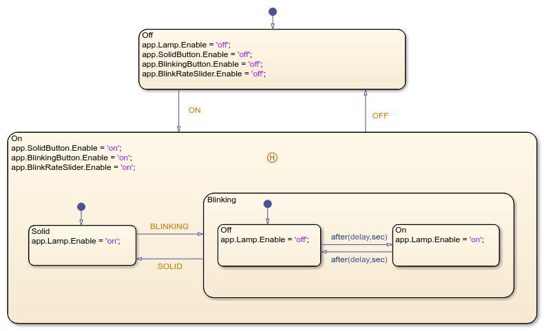 Le fichier sf_lamp_logic.sfx définit un diagramme Stateflow autonome qui implémente la logique pour l’interface utilisateur. Le diagramme possède des événements en entrée (ON, OFF, BLINKING, et SOLID) et des données locales (delay et app). Les actions dans le diagramme contrôlent quels widgets sont accessibles depuis chaque état. Par exemple, les actions dans l’état Off grisent le widget Lampe, les boutons d’option Mode et le curseur Blink Rate de l’interface utilisateur.