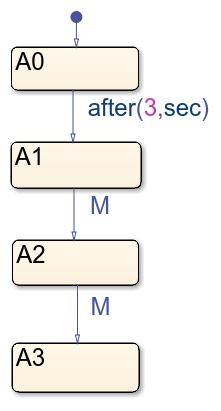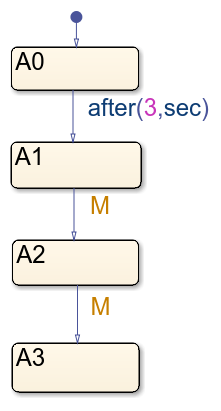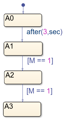 Le diagramme DataReceiver s’exécute une fois à chaque pas de temps. Au début de la simulation, l’état A0 est actif. Au pas de temps t=3, la transition de A0 vers A1 se produit. Au pas de temps t=4, le diagramme teste si M est égal à 1. La condition est vraie donc le diagramme transitionne de A1 vers A2. Au pas de temps t=5, M est toujours égal à 1, donc le diagramme transitionne de A2 vers A3. Sur le scope, vous voyez que DataReceiver change d’état trois fois.