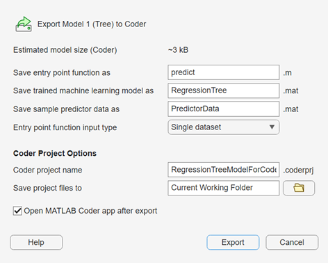 3. In the Export Regression Model to Coder dialog box, edit the names of the entry-point function file, the trained machine learning model file, and the sample predictor data file, if necessary. You can specify the entry-point function to accept a single data set or a list of individual predictors. Enter a name for your coder project, and select a folder for your project files. Ensure that Open MATLAB Coder app after export is selected and click Export.